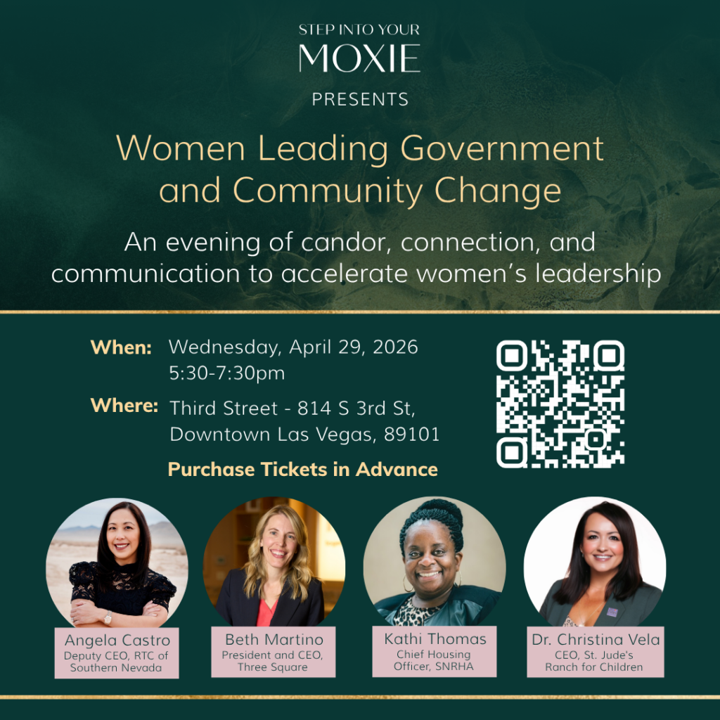 Hosted by Step into Your Moxie, with ticket sales benefitting THIRD Street, the event will feature a candid panel conversation with Angela Castro, Deputy Chief Executive Officer of the Regional Transportation Commission of Southern Nevada; Beth Martino, President and CEO of Three Square Food Bank; Kathi Thomas, Chief Housing Officer of the Southern Nevada Regional Housing Authority; and Dr. Christina Vela, CEO of St. Jude’s Ranch for Children.